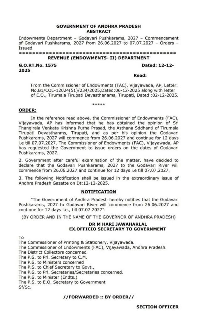 గోదావరి పుష్కరాలు-2027 నిర్వహణకు సంబంధించి ఆంధ్రప్రదేశ్ ప్రభుత్వం కీలక నిర్ణయం తీసుకుంది. భక్తులకు శుభవార్త చెబుతూ, 2027 జూన్ 26 నుంచి జూలై 7 వరకు మొత్తం 12 రోజుల పాటు పుష్కరాలను నిర్వహించనున్నట్లు ప్రభుత్వం అధికారికంగా ప్రకటించింది. తిరుమల జ్యోతిష్య సిద్ధాంతి తంగిరాల వెంకట కృష్ణ పూర్ణ ప్రసాద్ అందించిన పండితాభిప్రాయాన్ని ఆధారంగా చేసుకుని ఈ తేదీలను ప్రభుత్వం ఖరారు చేసింది. దీనికి అనుగుణంగా దేవాదాయ శాఖ ఎక్స్ ఆఫిషియో సెక్రటరీ డా. ఎం. హరి జవహర్లాల్ అధికారిక ఉత్తర్వులు జారీ చేశారు. గోదావరి పుష్కరాల తేదీల ఖరారుకు సంబంధించిన ప్రత్యేక నోటిఫికేషన్ను ఆంధ్రప్రదేశ్ గెజిట్లో విడుదల చేయనున్నారు.
